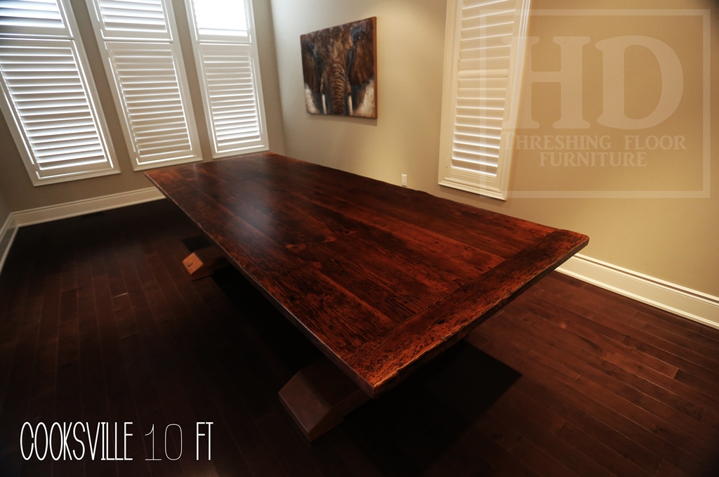 Copyright HD Threshing Floor Furniture / www.hdthreshing.dreamhosters.com/blogDetails: 10 ft Reclaimed Wood Pedestal Table – 48 Inches Wide – Hemlock Threshing Floor Construction – Hand-Hewn Pedestals Base Connected with Rail -Premium epoxy/ polyurethane finish