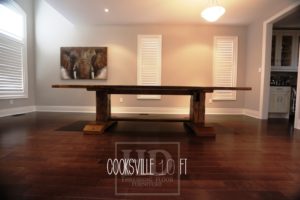 Details: 10 ft Reclaimed Wood Pedestal Table – 48 Inches Wide – Hemlock Threshing Floor Construction – Hand-Hewn Pedestals Base Connected with Rail -Premium epoxy/ polyurethane finish