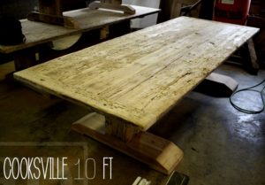 Details: 10 ft Reclaimed Wood Pedestal Table – 48 Inches Wide – Hemlock Threshing Floor Construction – Hand-Hewn Pedestals Base Connected with Rail -Premium epoxy/ polyurethane finish