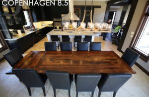 Specifications: 8.5 ft Reclaimed Wood Table – Matte Black Metal Base – Reclaimed Hemlock Threshing Floor Construction – Premium epoxy/polyurethane finish – One 24″ leaf extension – Original barn floor board edges maintained – 10 Black Tograin Leather Parsons ChairsÂÂ