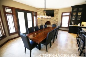 Specifications: 8.5 ft Reclaimed Wood Table – Matte Black Metal Base – Reclaimed Hemlock Threshing Floor Construction – Premium epoxy/polyurethane finish – One 24″ leaf extension – Original barn floor board edges maintained – 10 Black Tograin Leather Parsons ChairsÂÂ
