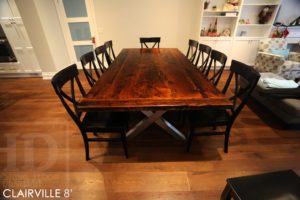 Description: 8 foot Rustic Reclaimed Wood Table – 48″ wide – X Shaped Stainless Steel Base- Premium epoxy/polyurethane finish – Solid Reclaimed Hemlock Threshing Floor Construction – Original barnwood edges maintainedÂÂ