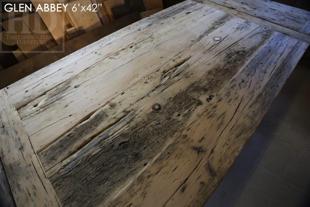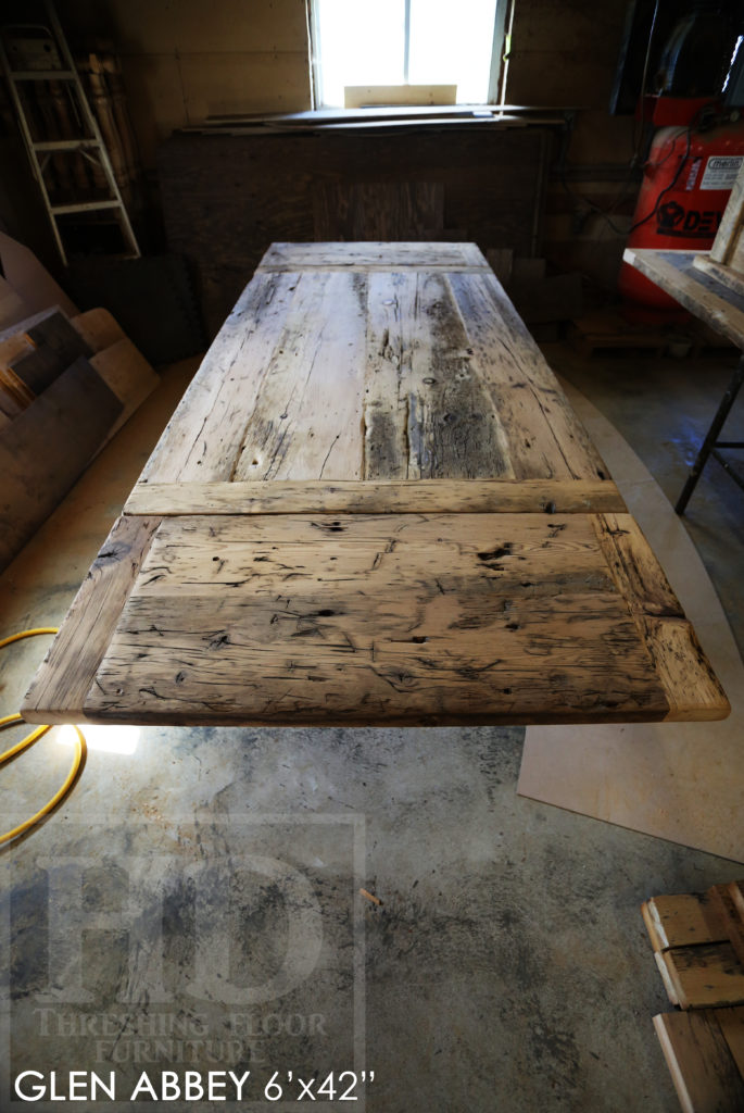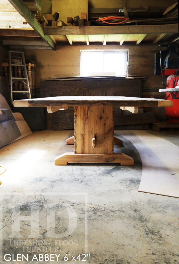 Description: 6 ft Reclaimed Wood Trestle Table – 42″ wide – Hemlock Threshing Floor Barnwood Construction – Rustic Character & Edges Maintained – Premium epoxy + matte polyurethane finish – Two 18″ Leaf Extensions [making total length 9 ft when extended] / Copyright HD Threshing Floor Furniture / www.hdthreshing.dreamhosters.com/blog