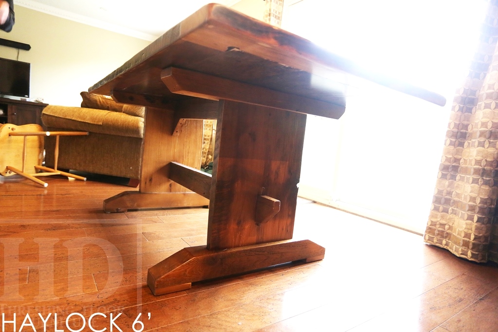 The older wood gets, the darker it gets. Since the raw material we use is over 150 years old, it comes to us very dark. As a result, we don’t need to stain anything [only clearcoat]. The less we sand, the darker the table will be. This Hemlock trestle table we made for a customer in Oakville is a sample of our medium sanding out of the raw material.