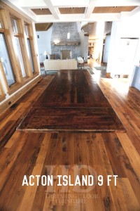 Details of table: 110″ Reclaimed Wood Trestle Table – 45″ wide – Reclaimed Threshing Floor Hemlock species – Premium epoxy & matte polyurethane finish – with two 18″ leaves