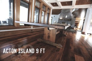 Details of table: 110″ Reclaimed Wood Trestle Table – 45″ wide – Reclaimed Threshing Floor Hemlock species – Premium epoxy & matte polyurethane finish – with two 18″ leaves