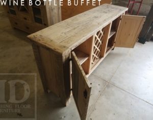 Specifications: Custom Wine Bottle Buffet Sideboard – Centre Wine Rack – 2 Doors – Corner Windbrace Beam Leg Posts – Reclaimed Hemlock Ontario Barnwood Construction – Threshing Floor Top – Grainery Board Base – Original Distressing Maintained