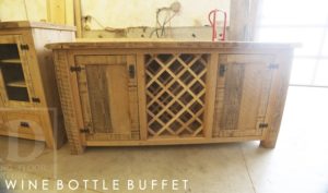 Specifications: Custom Wine Bottle Buffet Sideboard – Centre Wine Rack – 2 Doors – Corner Windbrace Beam Leg Posts – Reclaimed Hemlock Ontario Barnwood Construction – Threshing Floor Top – Grainery Board Base – Original Distressing Maintained