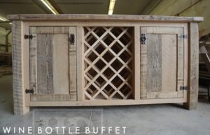 Specifications: Custom Wine Bottle Buffet Sideboard – Centre Wine Rack – 2 Doors – Corner Windbrace Beam Leg Posts – Reclaimed Hemlock Ontario Barnwood Construction – Threshing Floor Top – Grainery Board Base – Original Distressing Maintained
