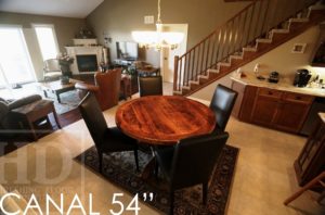 Details: 54″ Round Pedestal Table – Reclaimed Cedar Hydro Pole Base – 2″ Reclaimed Hemlock Threshing Floor Board Top – Premium epoxy & matte polyurethane finish – 4 Topgrain Leather Black Parsons Chairs – Posted by Gerald Reinink, Design & Sales