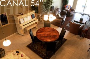 Details: 54″ Round Pedestal Table – Reclaimed Cedar Hydro Pole Base – 2″ Reclaimed Hemlock Threshing Floor Board Top – Premium epoxy & matte polyurethane finish – 4 Topgrain Leather Black Parsons Chairs – Posted by Gerald Reinink, Design & Sales
