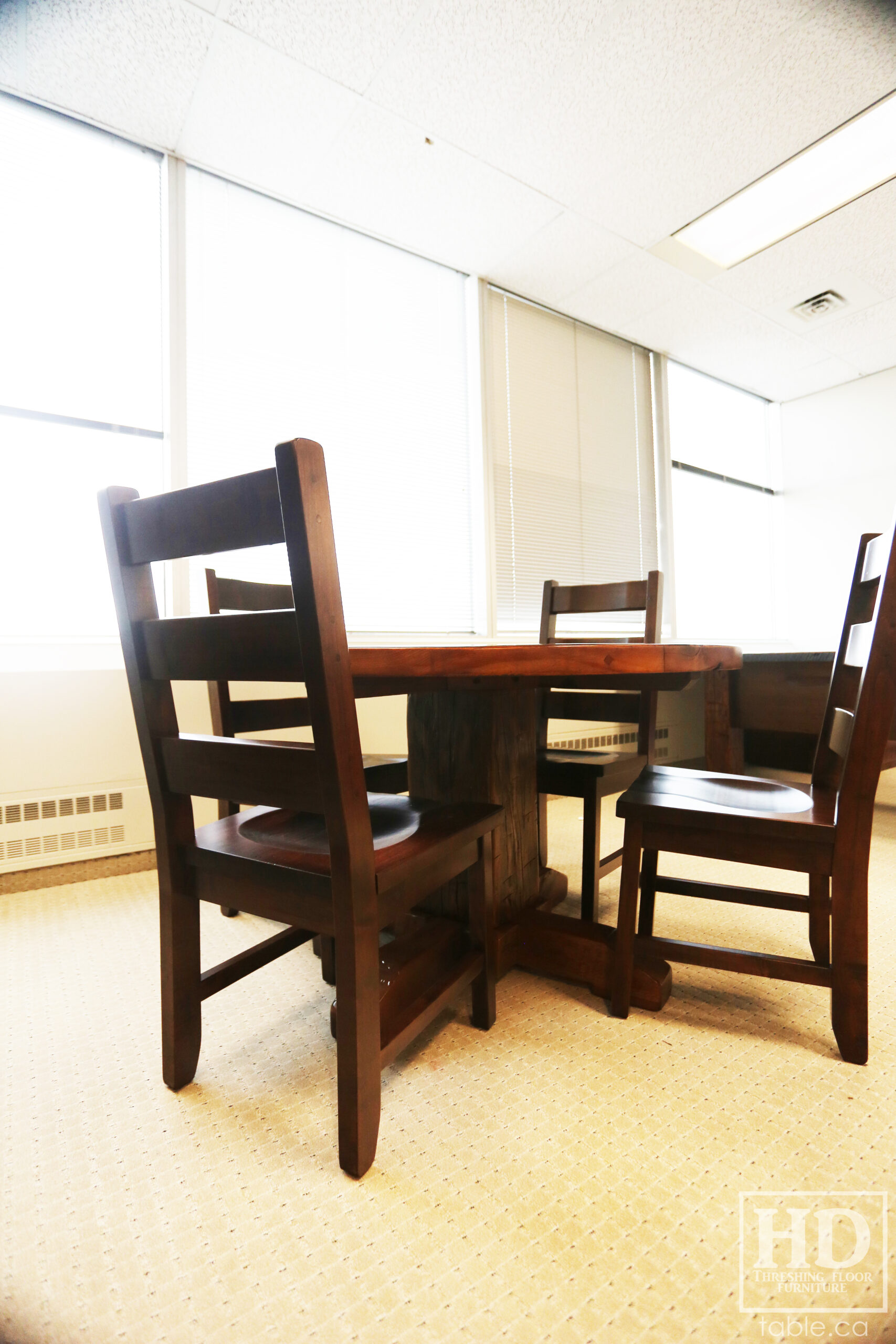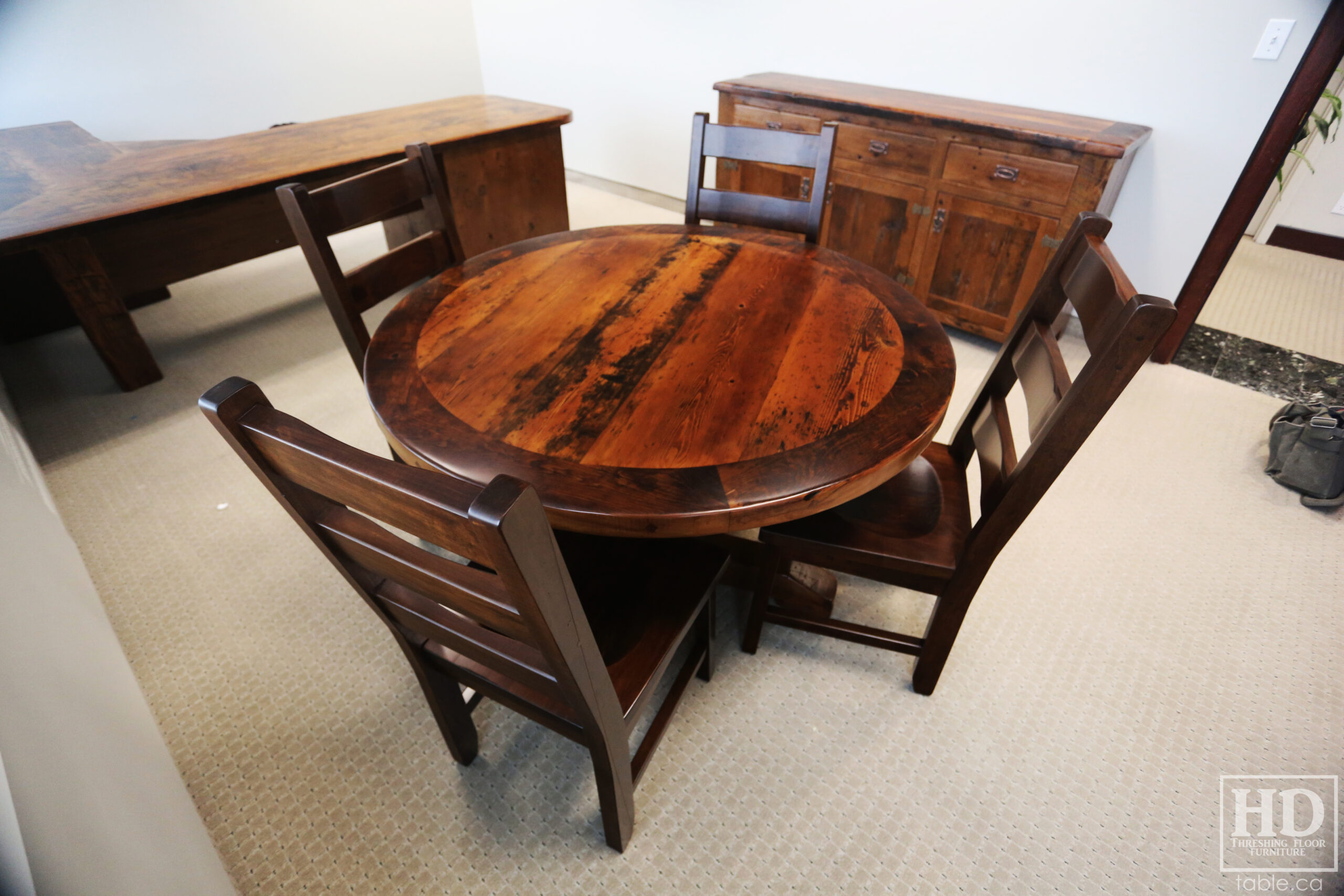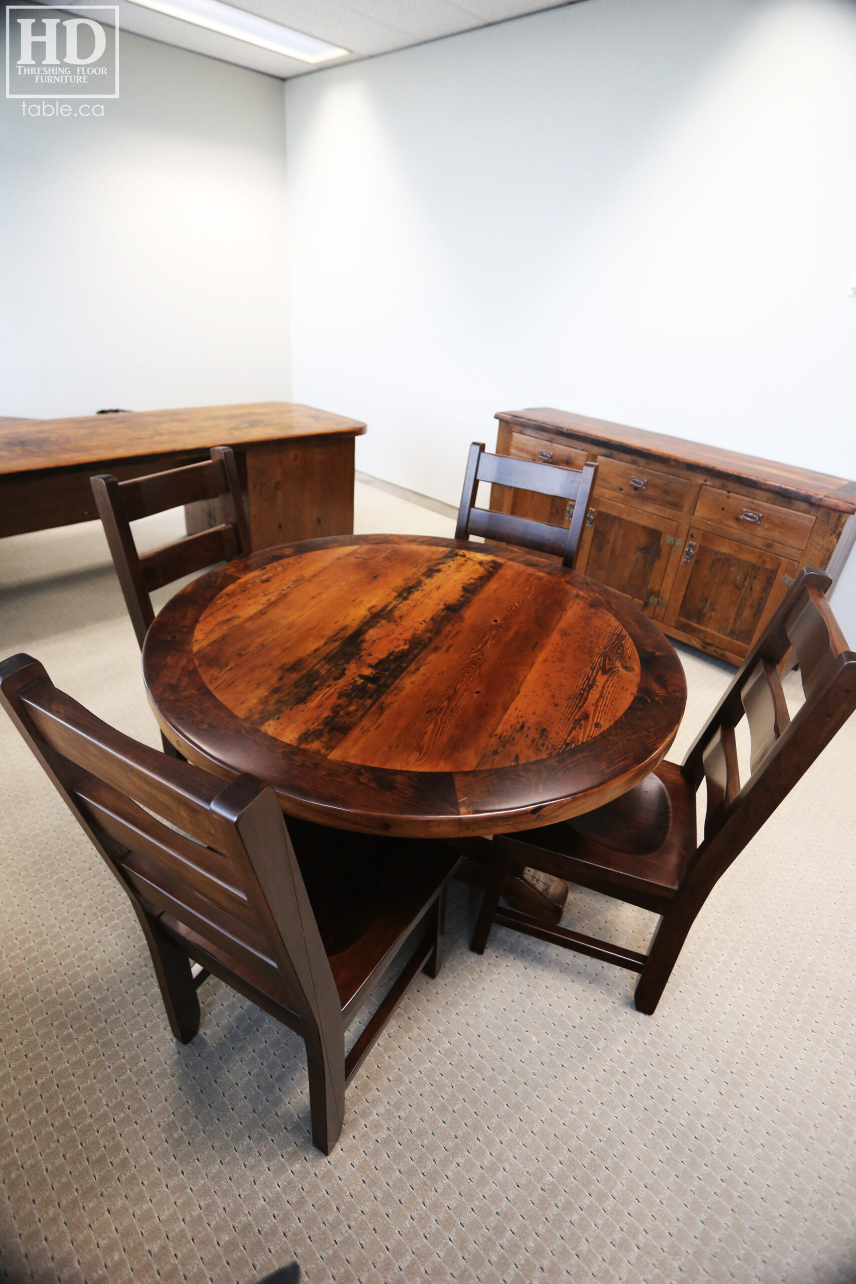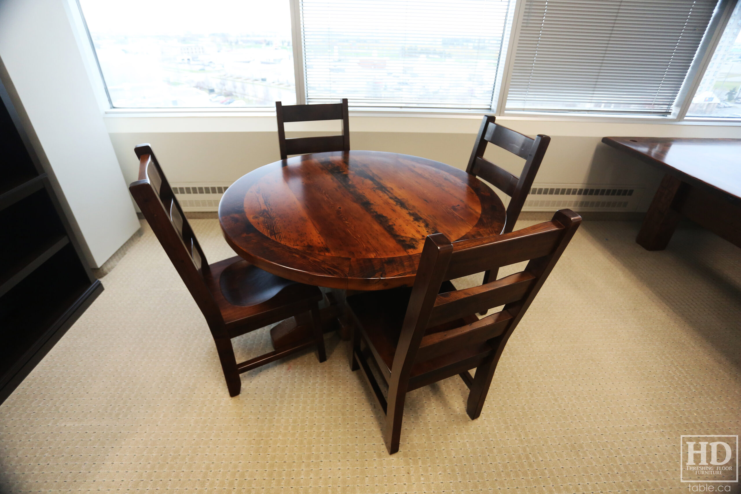 Tagged cottage furniture Ontario, cottage table Ontario, custom finished chairs, custom wood chairs, Distressed wood round table, epoxy finish, Gerald Reinink, HD Threshing Floor Furniture, mennonite built chairs, office furniture, office table, Ontario barns, Ontario barnwood, Ontario made, Ontario wood, polyurethane, reclaimed wood furniture, reclaimed wood table, round barnwood table, round boardroom table, round pedestal table, round reclaimed table, round reclaimed wood pedestal table, round table, rustic table, rustic wood table, solid wood, solid wood chair, threshing floor furniture, threshing floor table, threshing table, Toronto, wormy maple