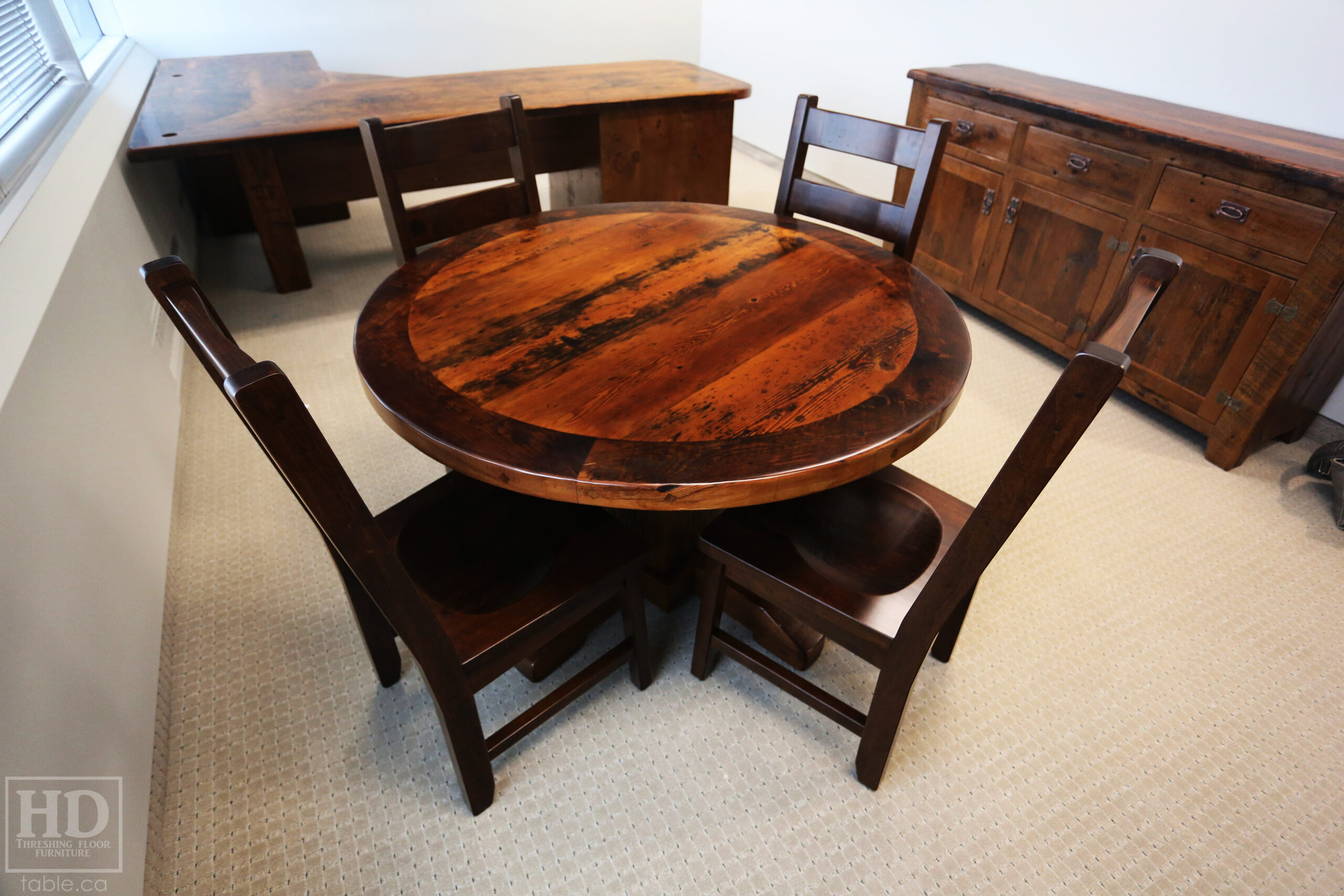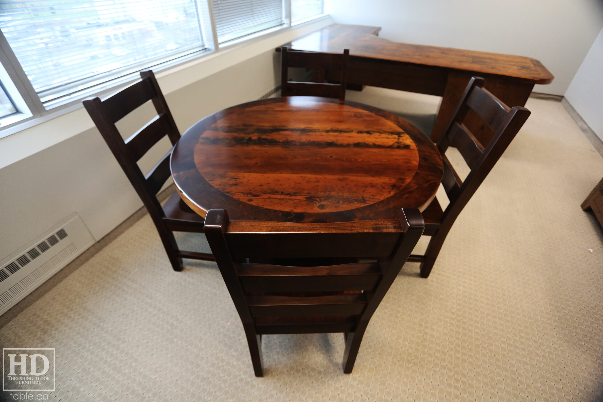 Given our good-to-write-on finish, we offer reclaimed wood office furniture. The modern finish combined with the old wood provides a unique but also refined look. Check out this custom reclaimed wood round table with some wormy maple ladder back chairs we made for a Toronto office: