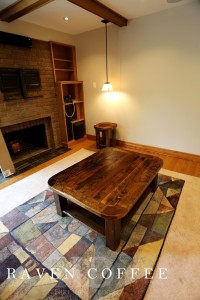 Details: 48†x 36†Coffee Table – with a 1†grainery board shelf – 4†x 4†windbrace legs – Reclaimed Threshing Floor Board Hemlock – rounded corners – Premium (lighter coating) epoxy/matte polyurethane finish