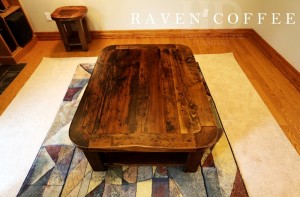 Details: 48†x 36†Coffee Table – with a 1†grainery board shelf – 4†x 4†windbrace legs – Reclaimed Threshing Floor Board Hemlock – rounded corners – Premium (lighter coating) epoxy/matte polyurethane finish