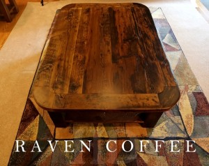 Details: 48†x 36†Coffee Table – with a 1†grainery board shelf – 4†x 4†windbrace legs – Reclaimed Threshing Floor Board Hemlock – rounded corners – Premium (lighter coating) epoxy/matte polyurethane finish