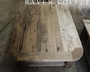 Details: 48†x 36†Coffee Table – with a 1†grainery board shelf – 4†x 4†windbrace legs – Reclaimed Threshing Floor Board Hemlock – rounded corners – Premium (lighter coating) epoxy/matte polyurethane finish