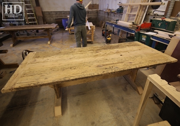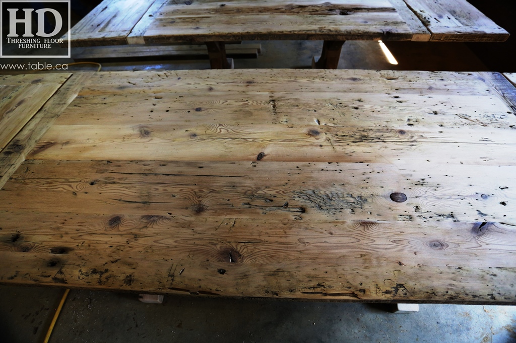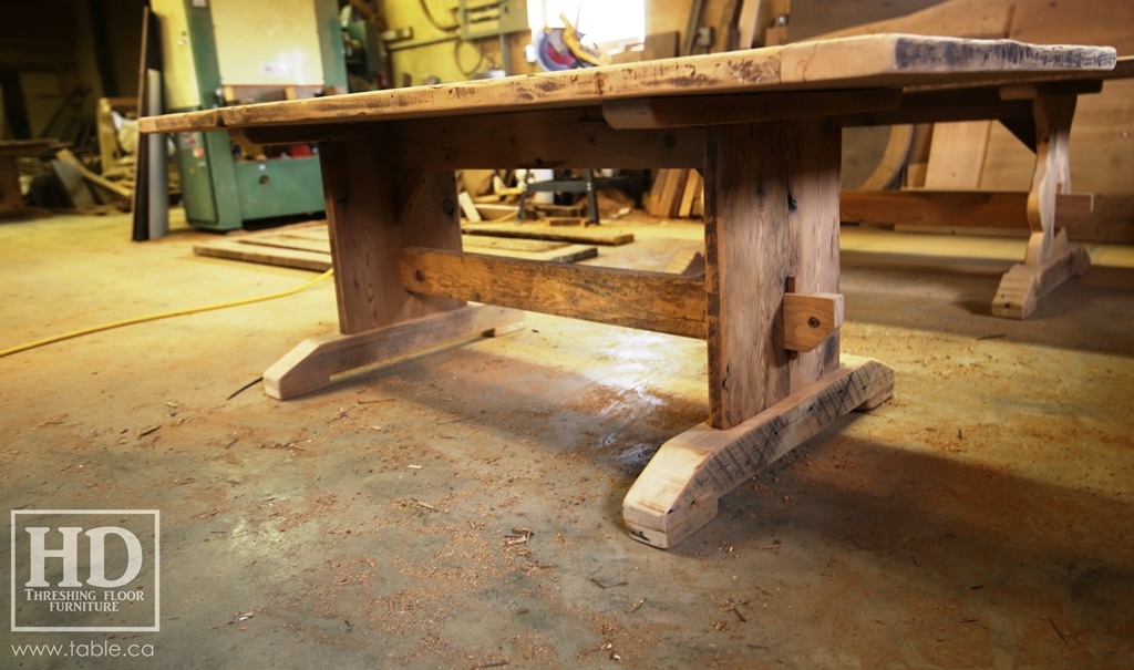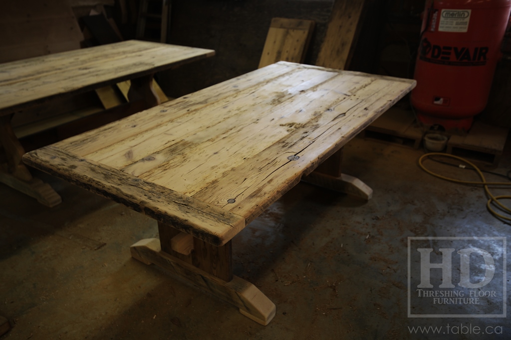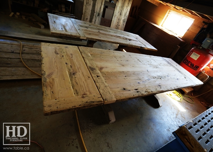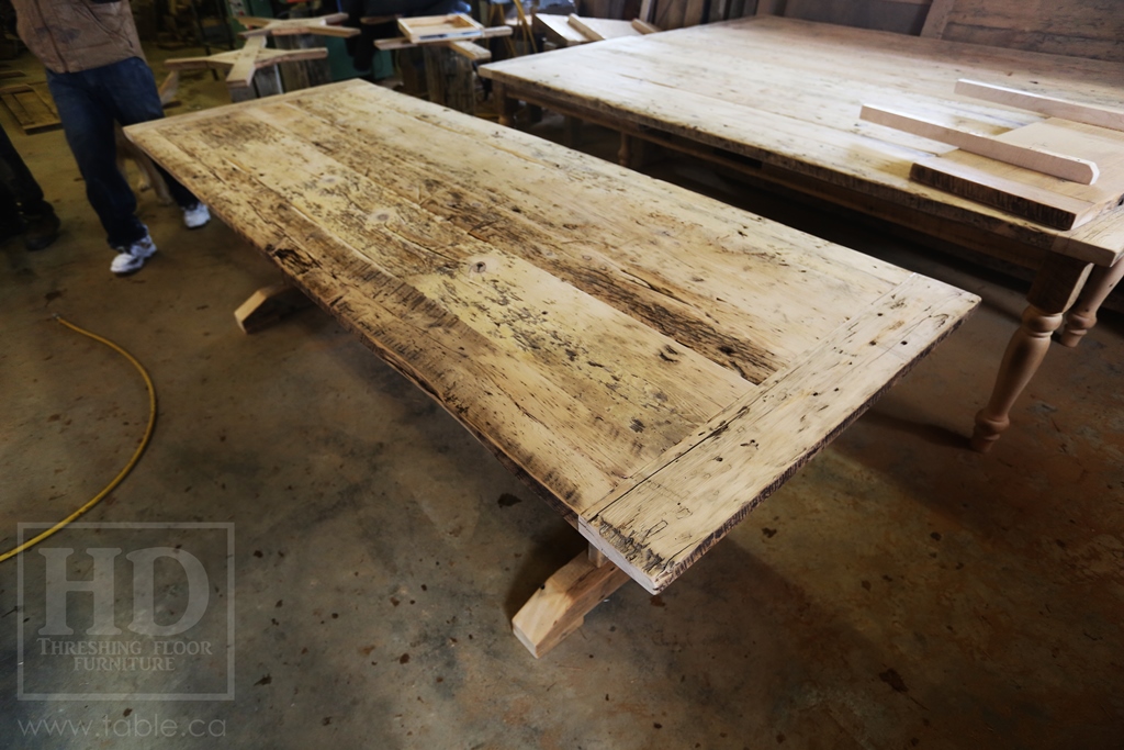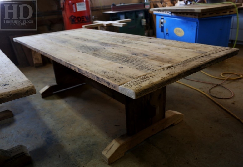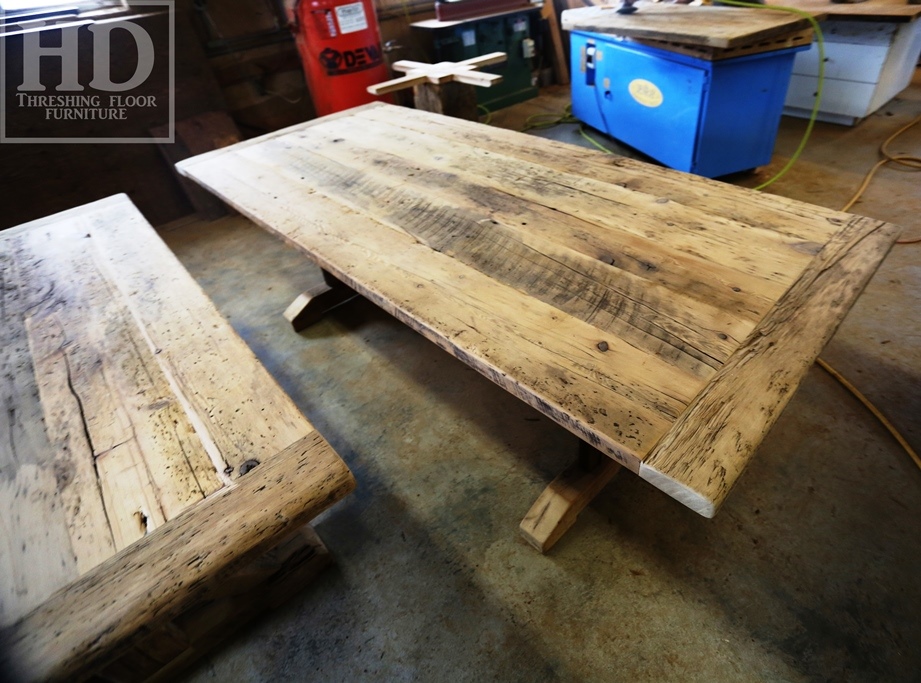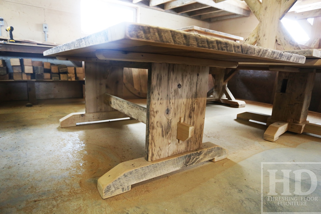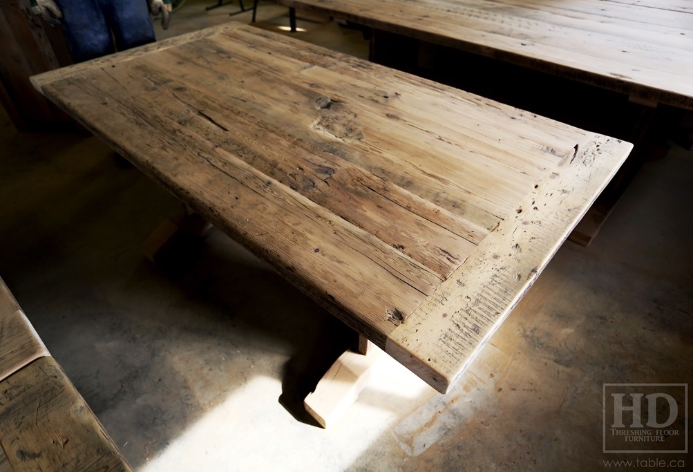 Description: Reclaimed Wood Trestle Tables Made from Ontario Barnwood – Antique Pioneer Distressing Maintained – Custom Made by Hand – Original edges kept – Reclaimed Hemlock and Pine Threshing Floor Construction