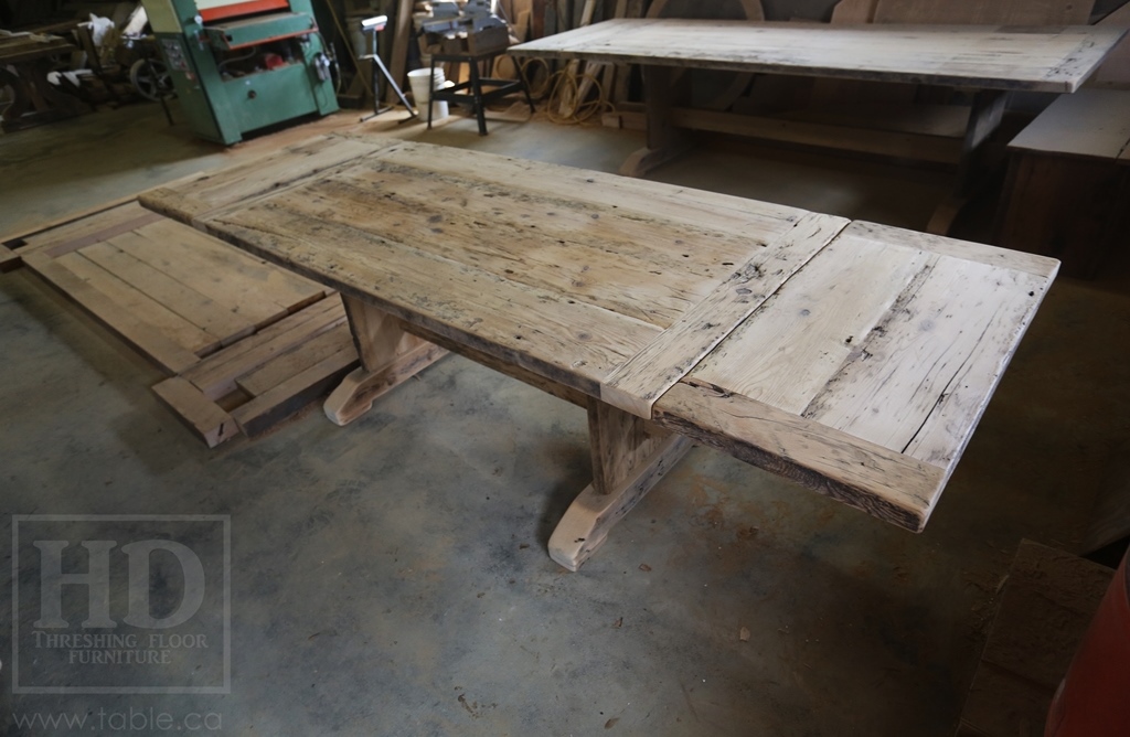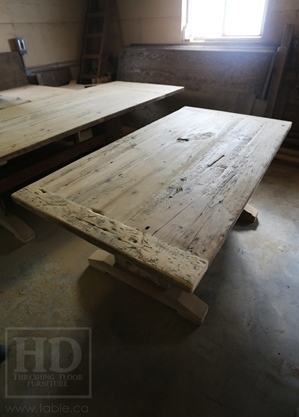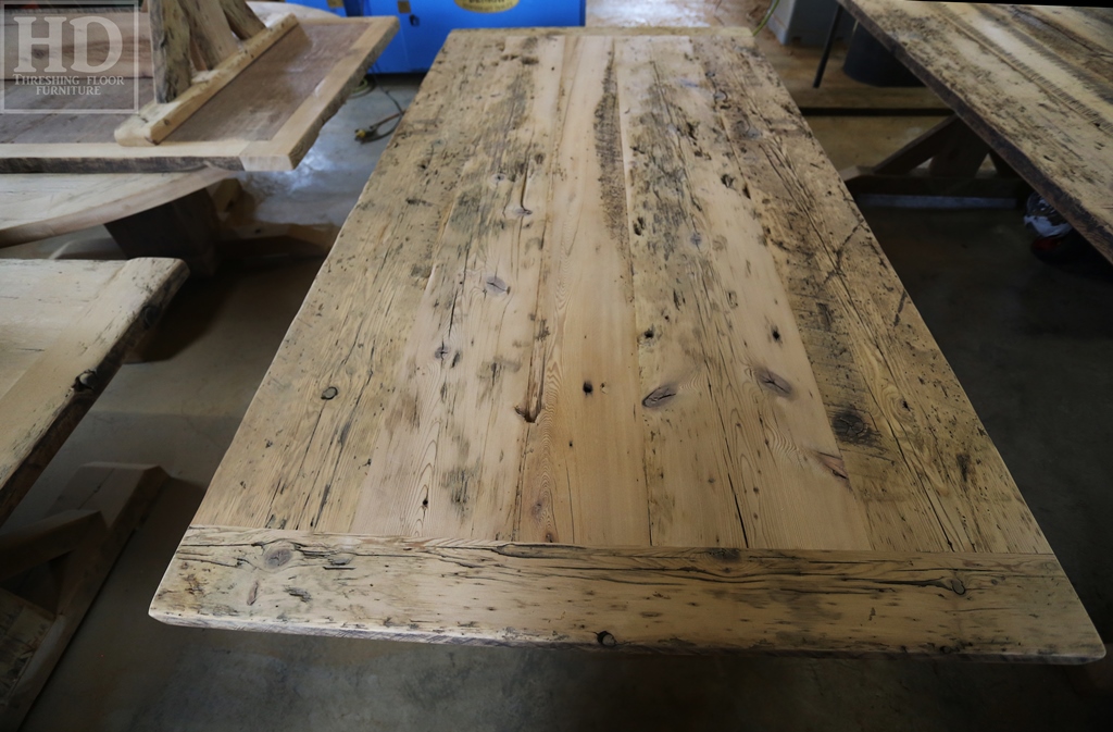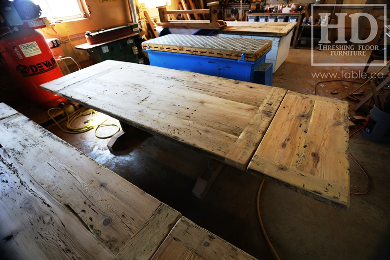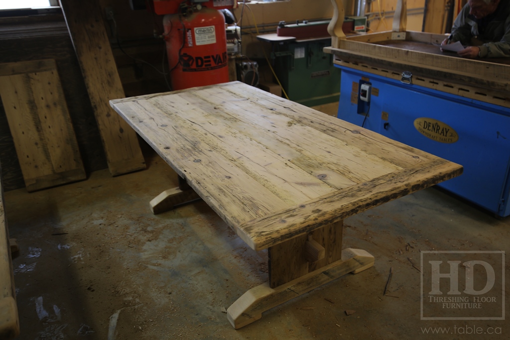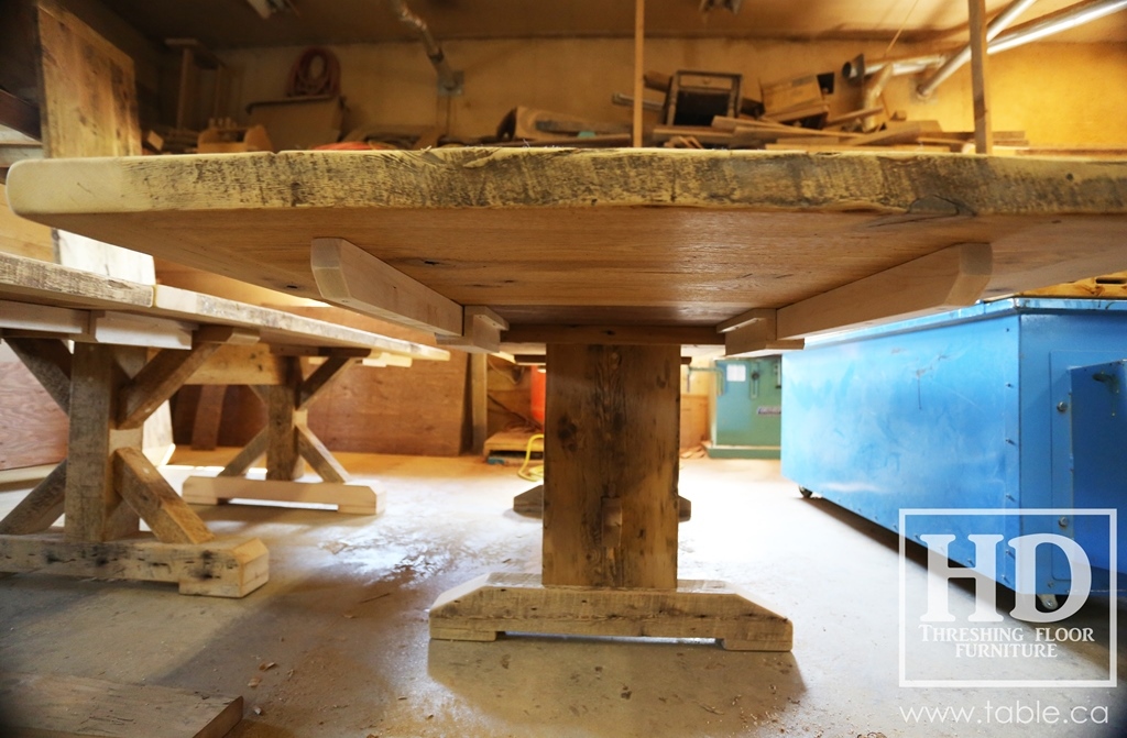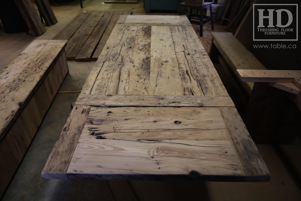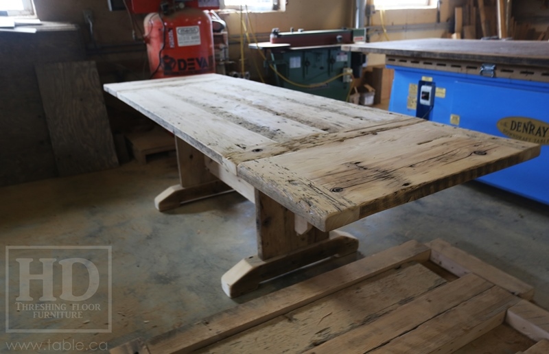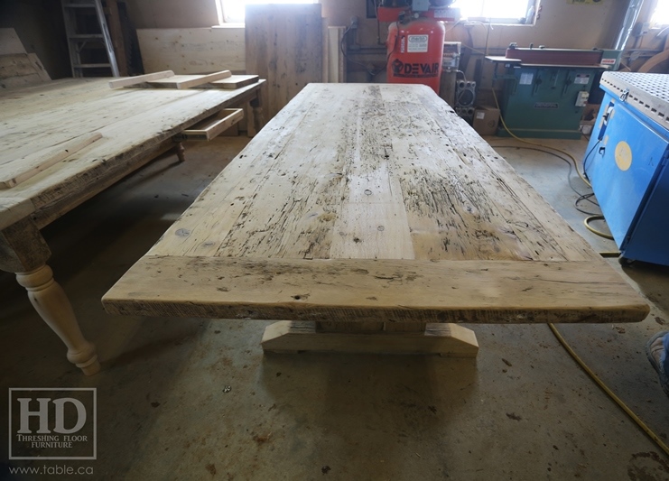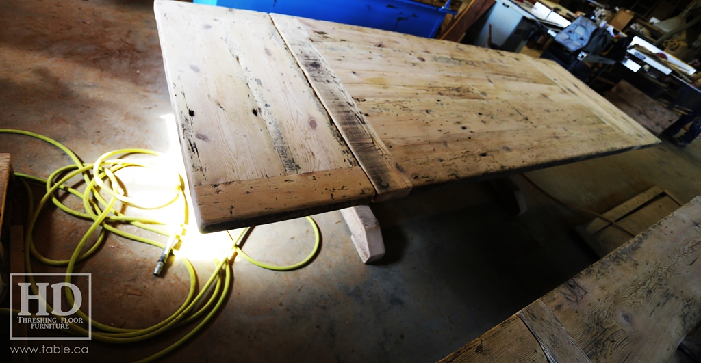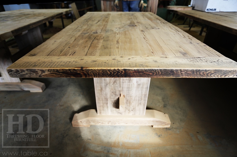 Description: Reclaimed Wood Trestle Tables Made from Ontario Barnwood – Antique Pioneer Distressing Maintained – Custom Made by Hand – Original edges kept – Reclaimed Hemlock and Pine Threshing Floor Construction