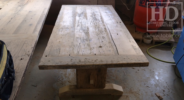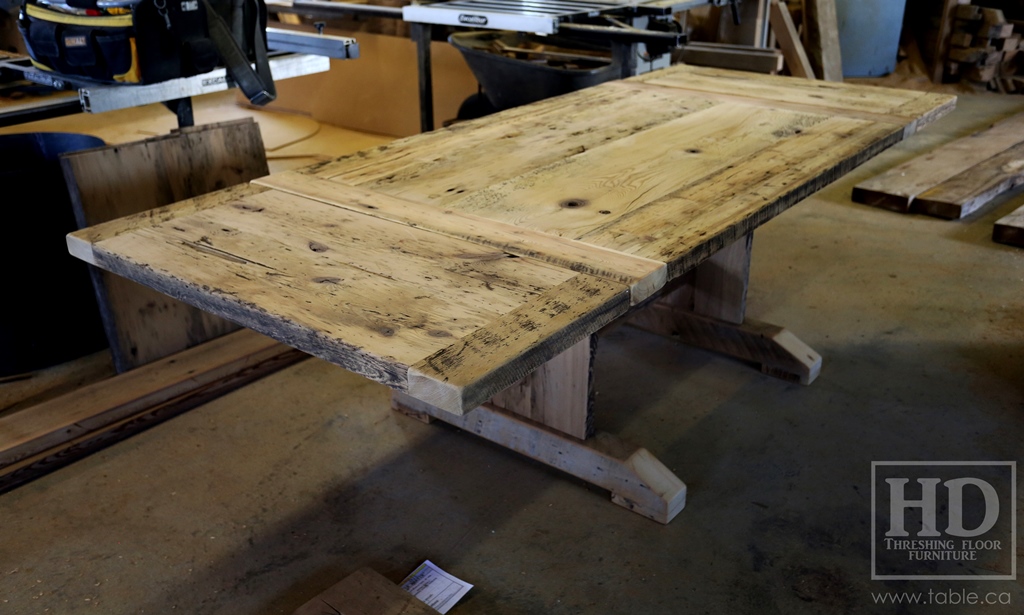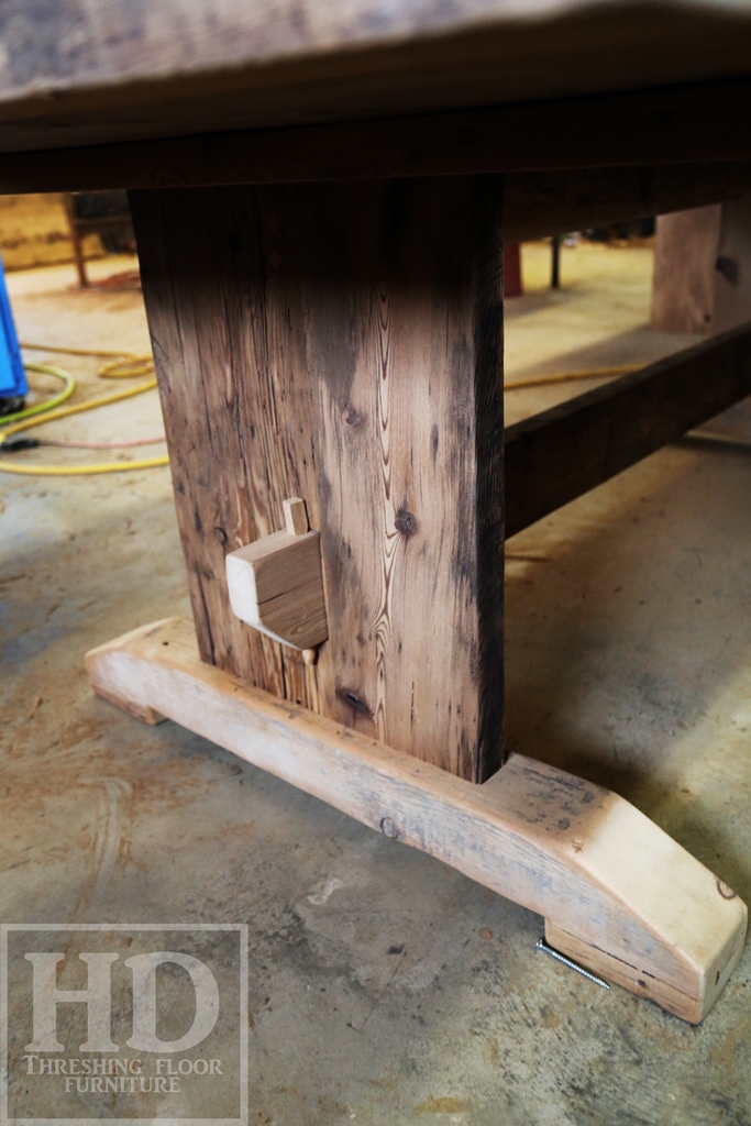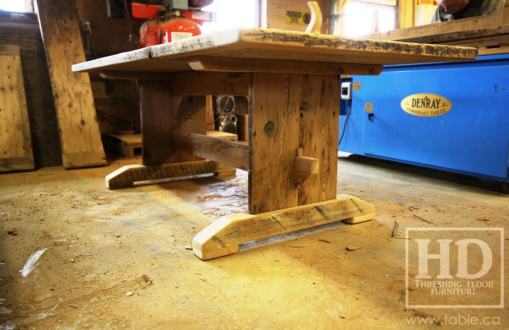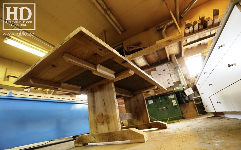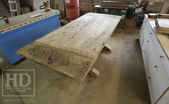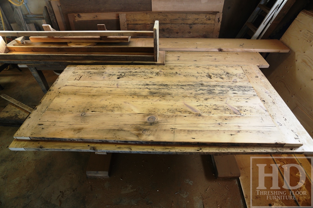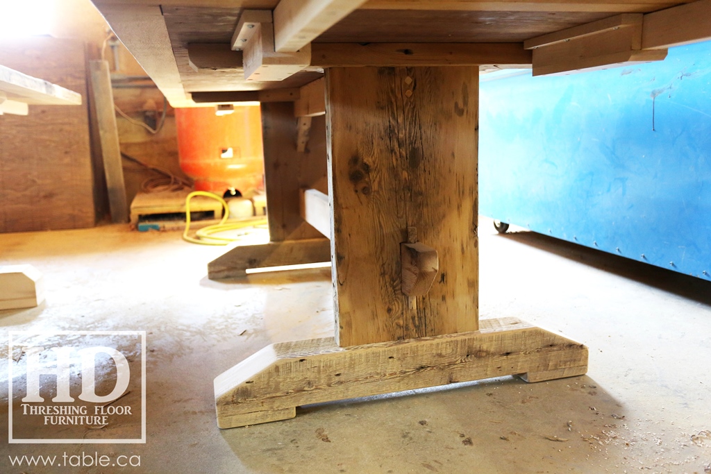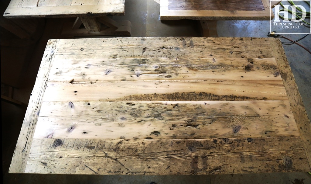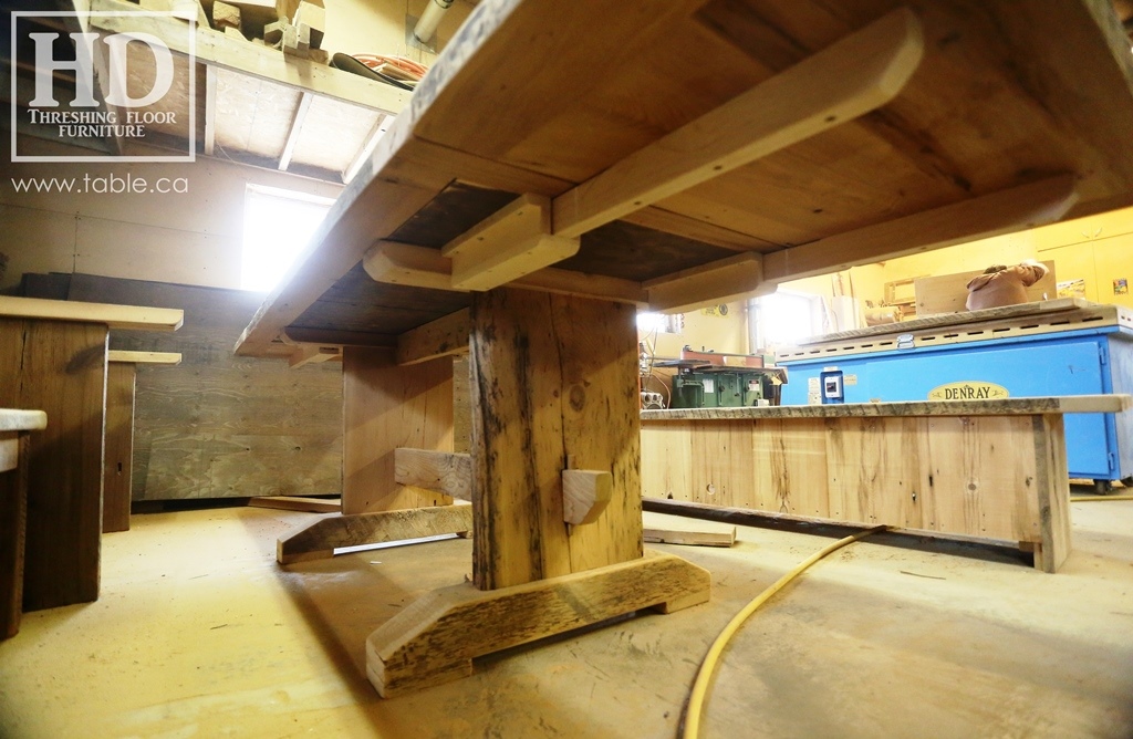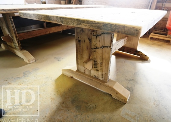 Description: Reclaimed Wood Trestle Tables Made from Ontario Barnwood – Antique Pioneer Distressing Maintained – Custom Made by Hand – Original edges kept – Reclaimed Hemlock and Pine Threshing Floor Construction