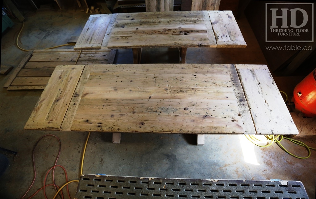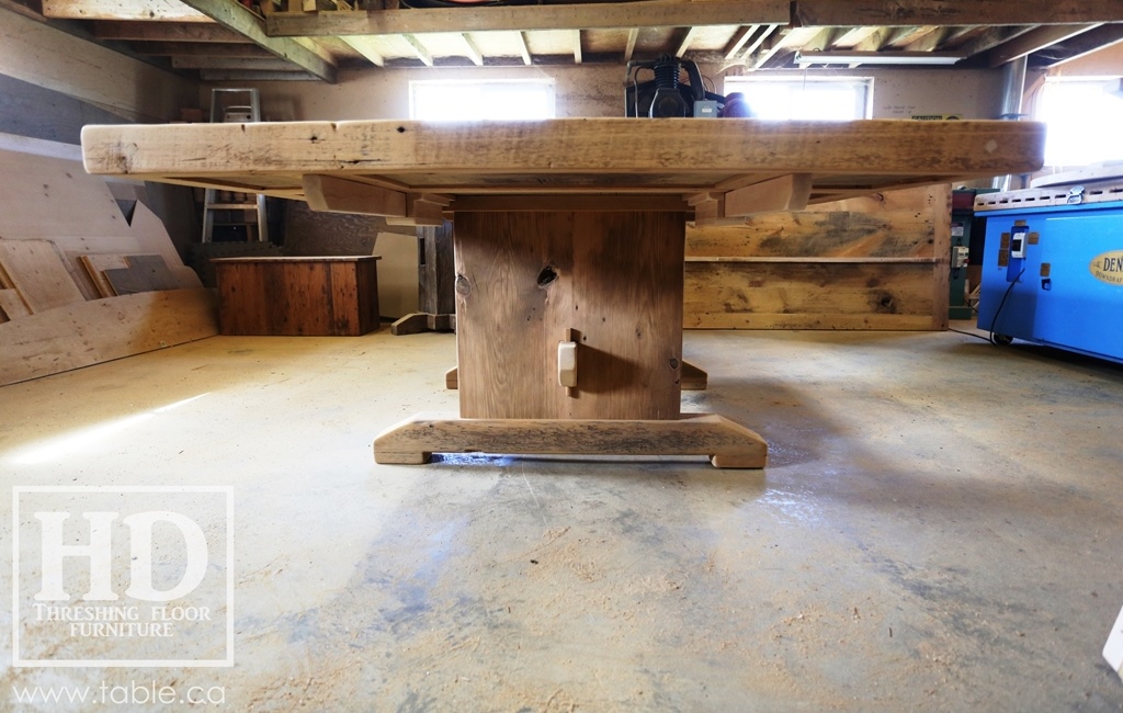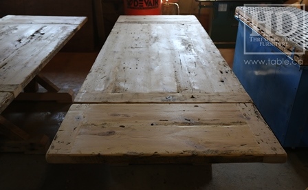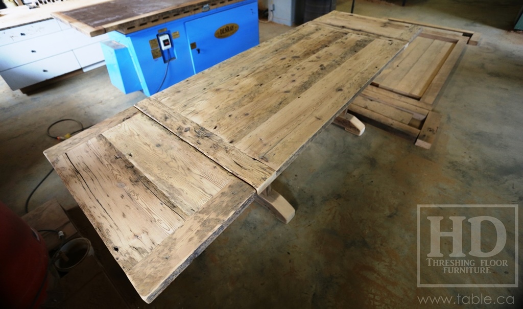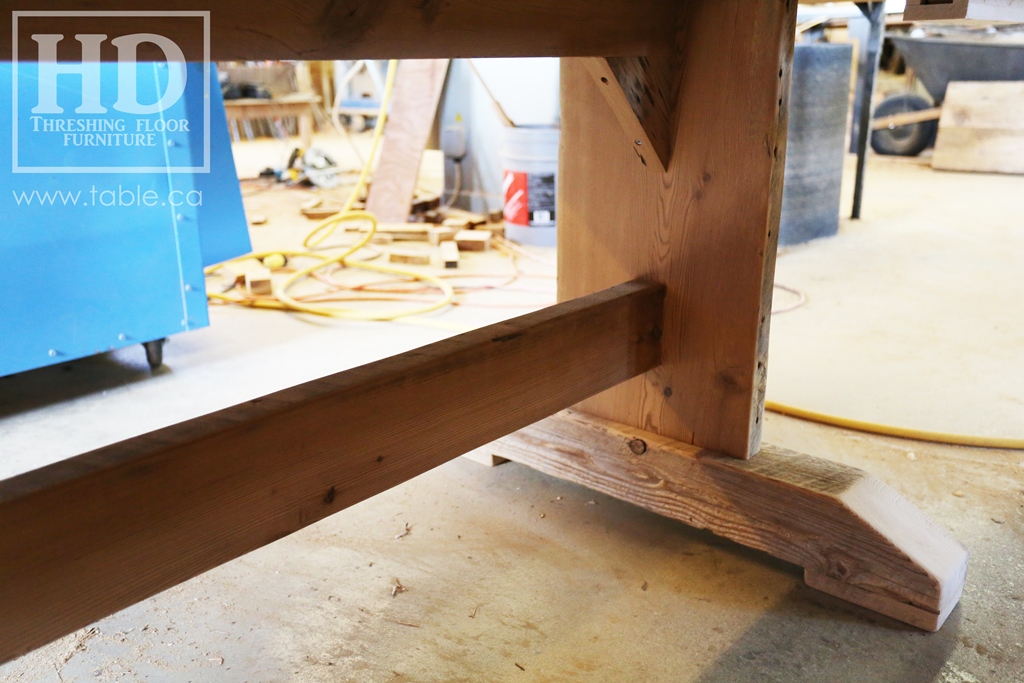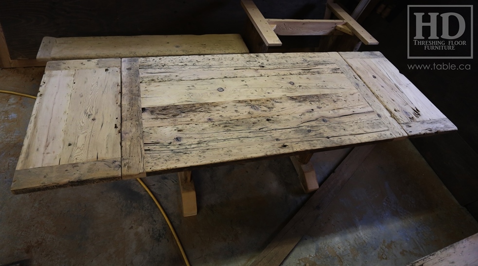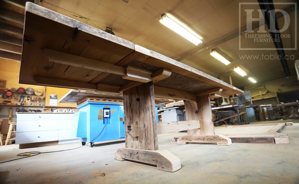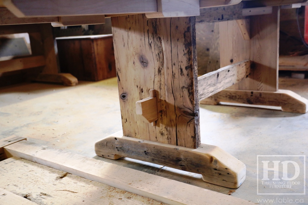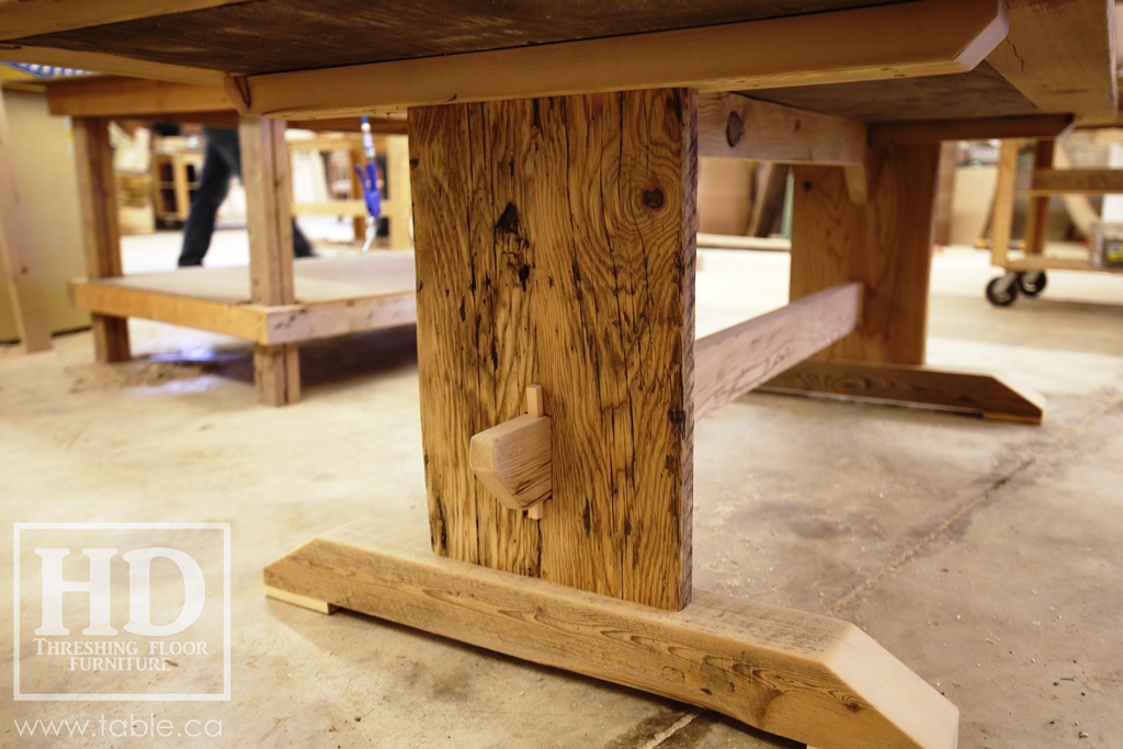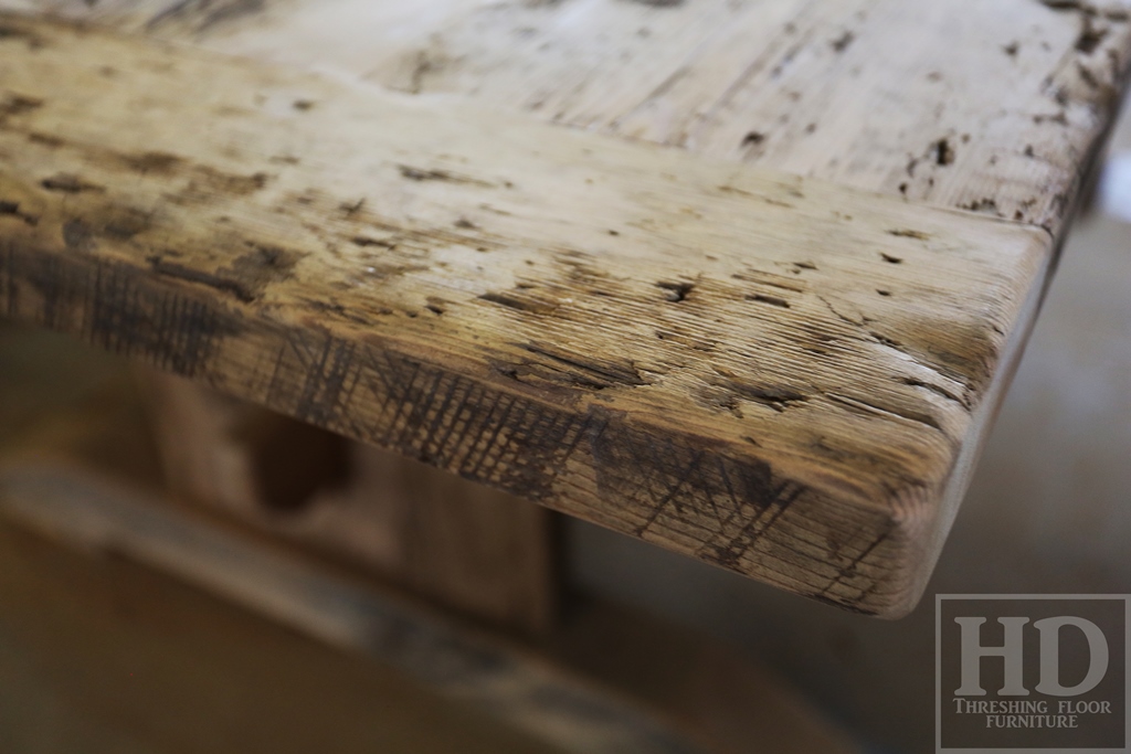 Description: Reclaimed Wood Trestle Tables Made from Ontario Barnwood – Antique Pioneer Distressing Maintained – Custom Made by Hand – Original edges kept – Reclaimed Hemlock and Pine Threshing Floor Construction