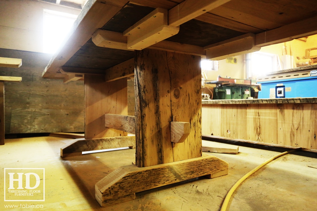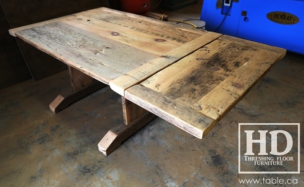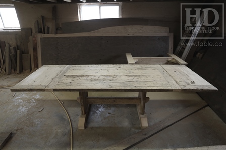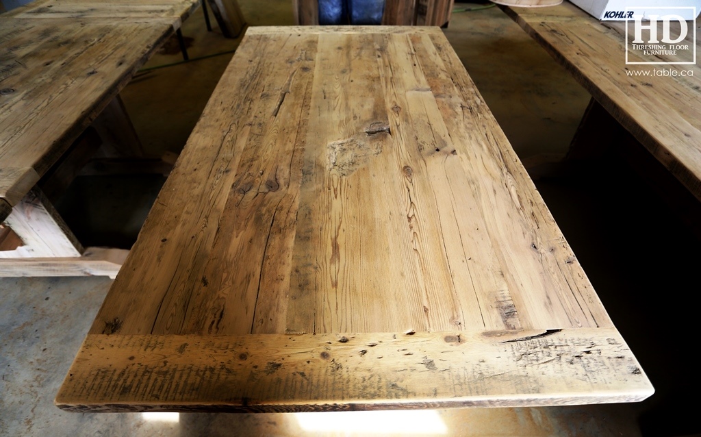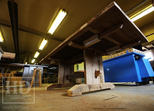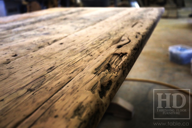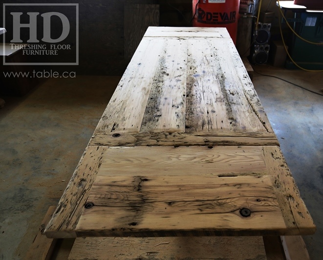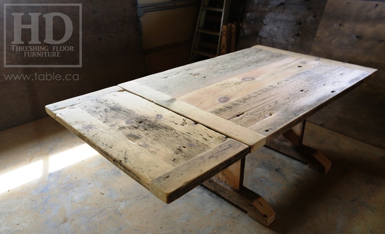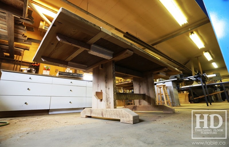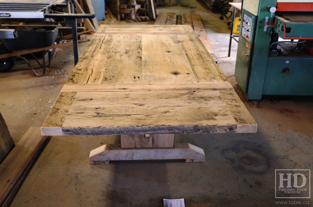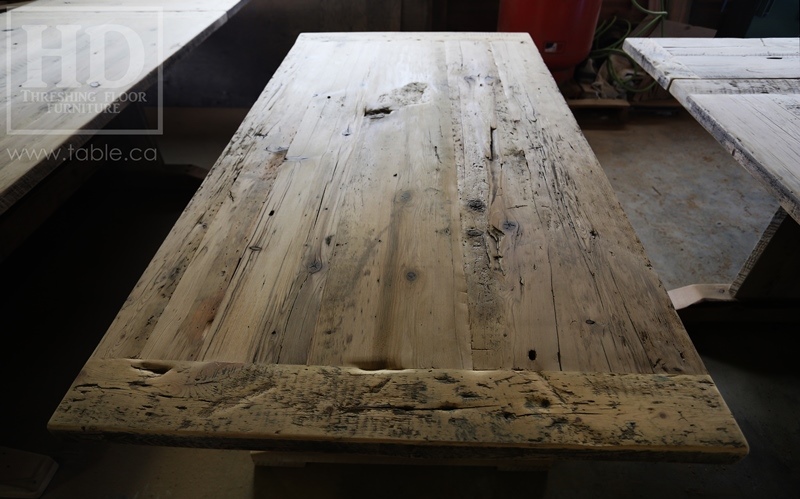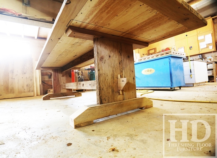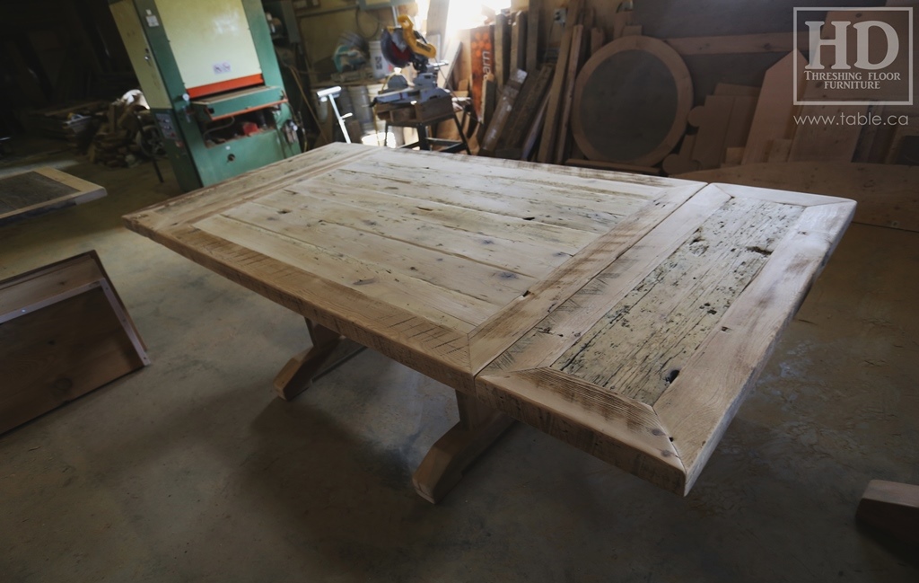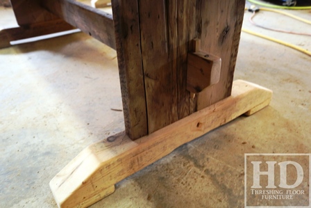 Description: Reclaimed Wood Trestle Tables Made from Ontario Barnwood – Antique Pioneer Distressing Maintained – Custom Made by Hand – Original edges kept – Reclaimed Hemlock and Pine Threshing Floor Construction