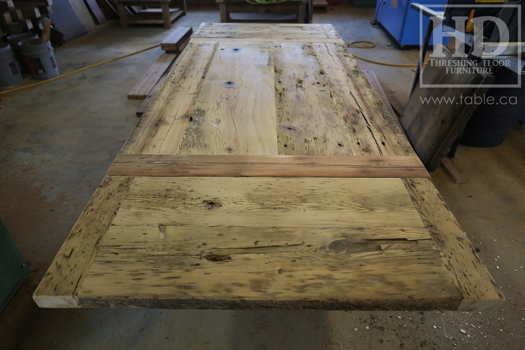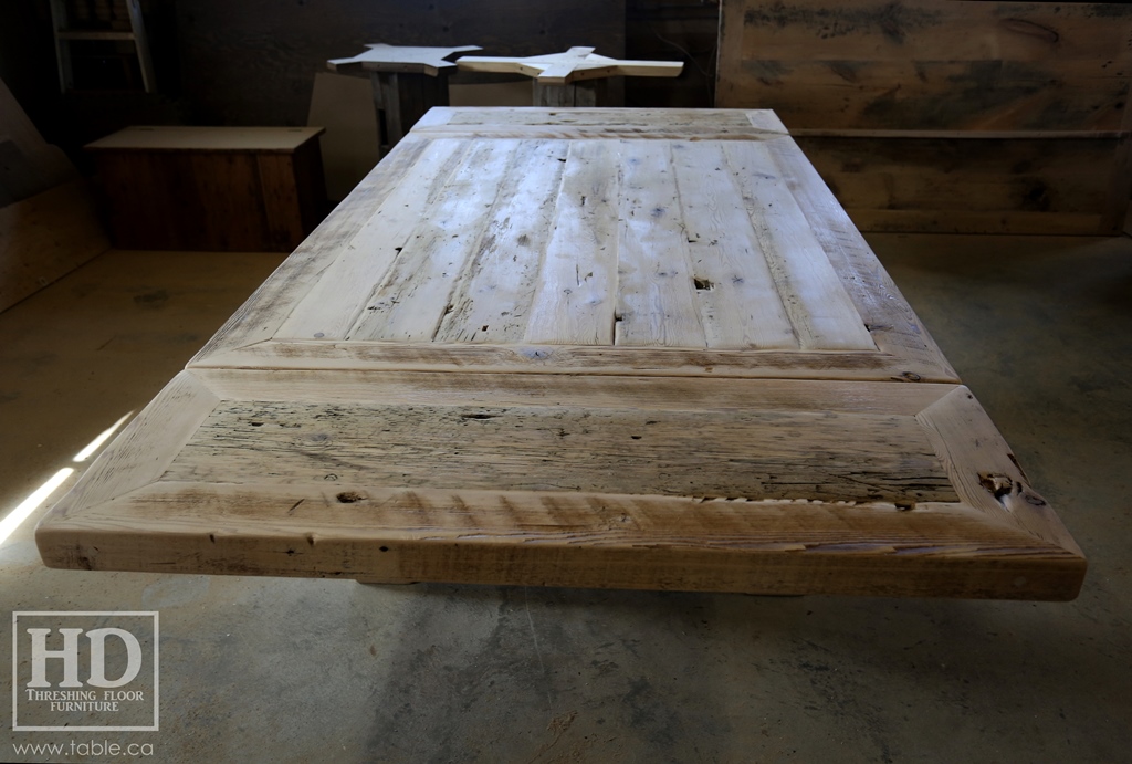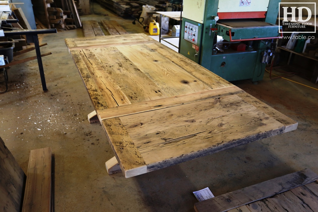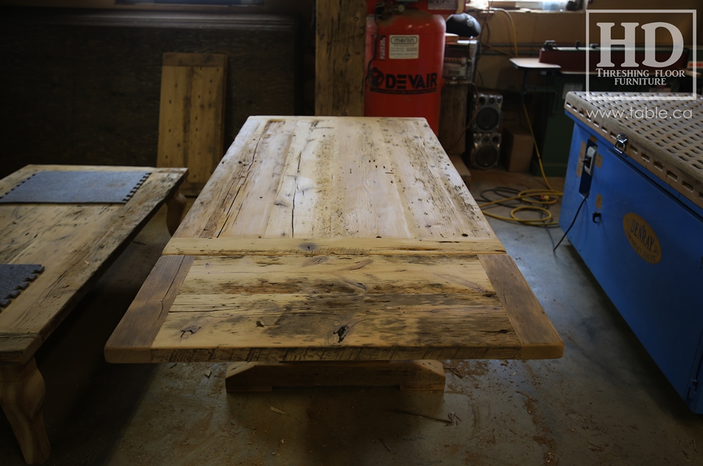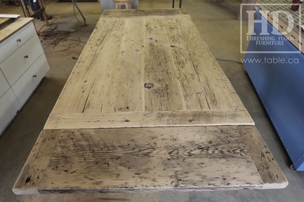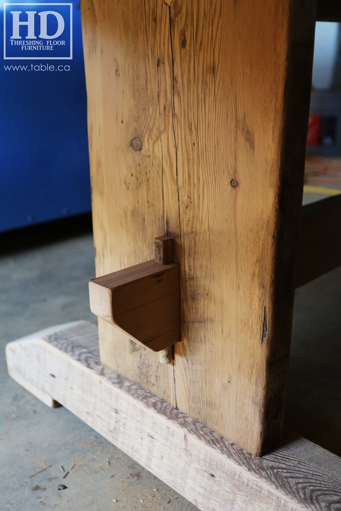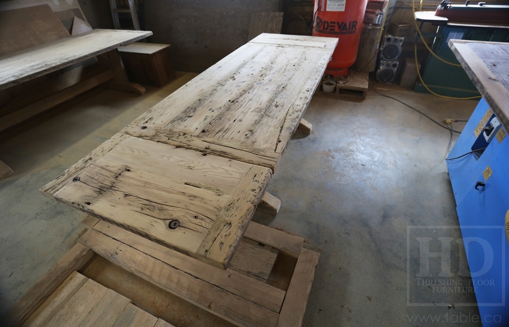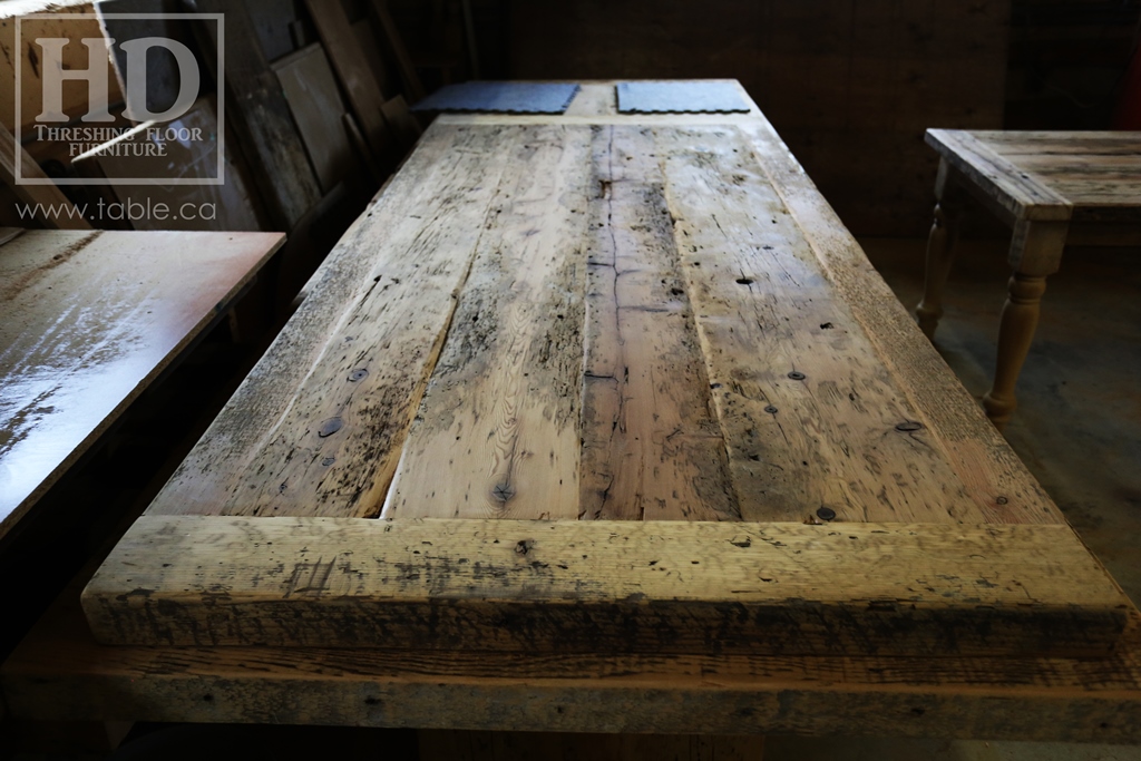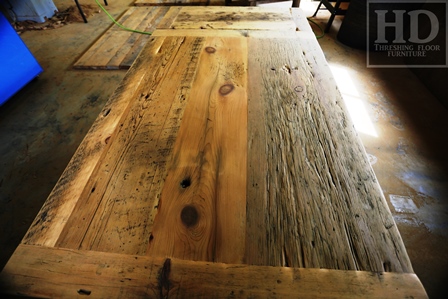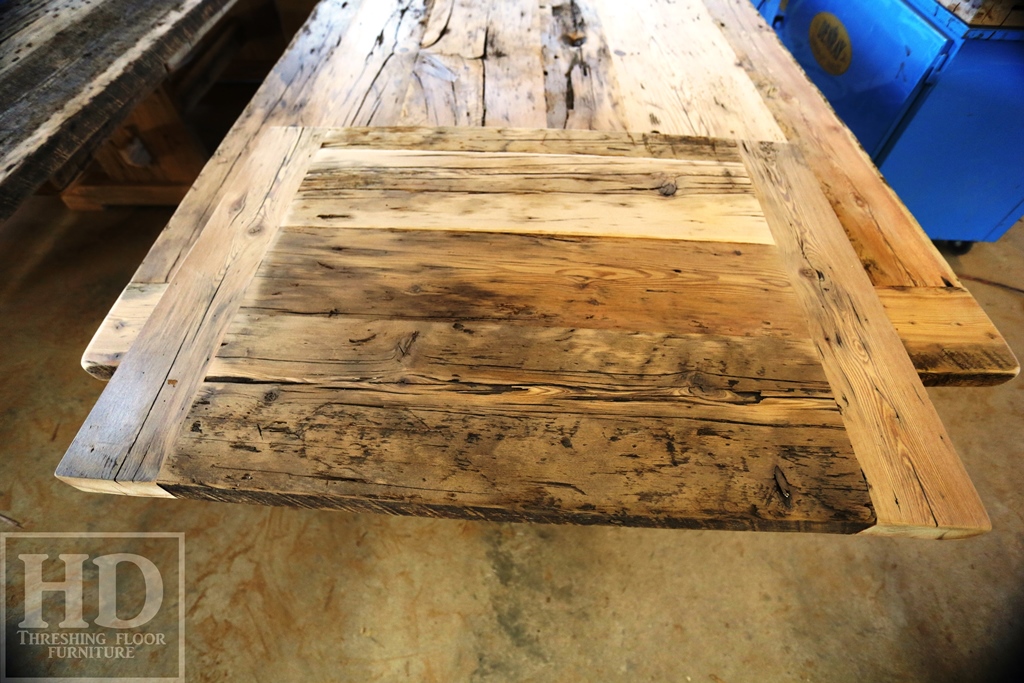 Description: Reclaimed Wood Trestle Tables Made from Ontario Barnwood – Antique Pioneer Distressing Maintained – Custom Made by Hand – Original edges kept – Reclaimed Hemlock and Pine Threshing Floor Construction