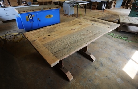 We keep almost all the distressing in the old wood we use. To demonstrate, check out these pictures of custom built trestle tables at the unfinished stage: