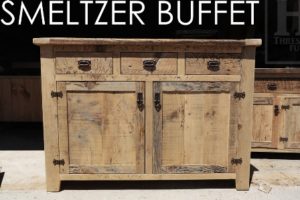 Description: 5 ft Reclaimed Wood Cottage Buffet – 18″ deep – 42″ [bar] Height – 3 drawers – 2 doors – Hemlock Threshing Floor & Granary Board Construction – Premium epoxy/polyurethane finish – Original Distressing Maintained – Lee Valley Hardware