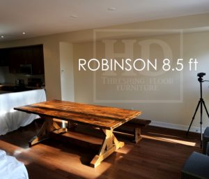 Description: 8.5 ft Reclaimed Wood Cottage Table – 42″ wide – Hemlock Threshing Floor Top – Premium epoxy/polyurethane finish – Sawbuck style base – Original barn floor board edges maintained