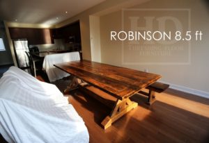 Description: 8.5 ft Reclaimed Wood Cottage Table – 42″ wide – Hemlock Threshing Floor Top – Premium epoxy/polyurethane finish – Sawbuck style base – Original barn floor board edges maintained