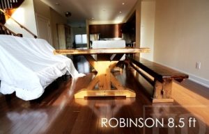 Description: 8.5 ft Reclaimed Wood Cottage Table – 42″ wide – Hemlock Threshing Floor Top – Premium epoxy/polyurethane finish – Sawbuck style base – Original barn floor board edges maintained