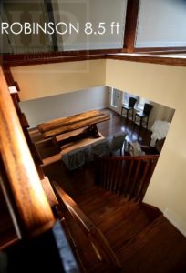 Description: 8.5 ft Reclaimed Wood Cottage Table – 42″ wide – Hemlock Threshing Floor Top – Premium epoxy/polyurethane finish – Sawbuck style base – Original barn floor board edges maintained