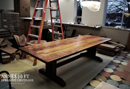 Description: 10 foot Simcoe Boardroom Table – Trestle Base – 3.5 ft wide – Reclaimed Barnwood Pine Threshing Floor – No Epoxy / Polyurethane Clearcoat Finish – Original Live Barnwood Edges