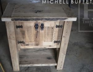 Description: 32″ Buffet End Table – 18″ deep – 36″ height – 2 doors – 2″ bottom shelf – Lee Valley Hardware – Reclaimed Hemlock Threshing Floor / Grainery Board Construction – Premium epoxy/satin polyurethane finish – 4″ x 4″ Windbrace Beam Legs