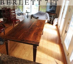 7 ft Harvest Table – 42″ wide – 3″ skirting – Reclaimed Hemlock Barnwood Construction – Premium epoxy/matte polyurethane finish – Tapered with a Notch Legs – Posted from Gerald Reinink