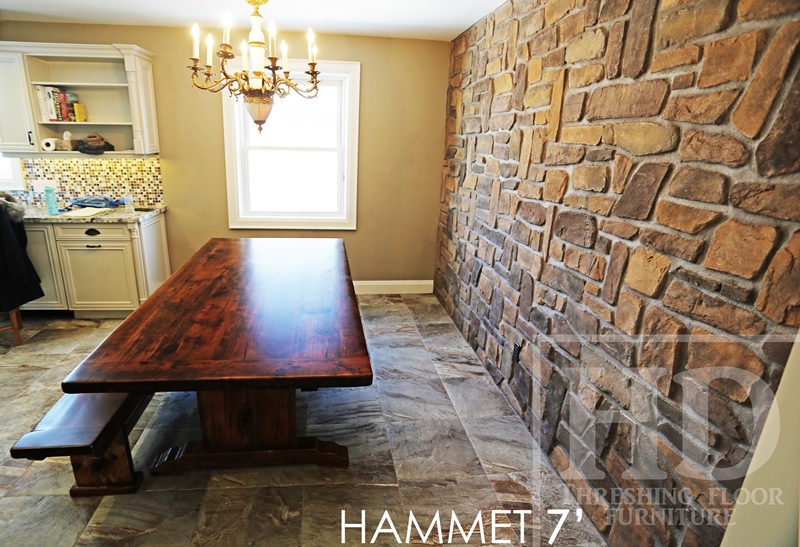 Details: 7′ Trestle Table – 42″ wide – Curved feet profile – Premium epoxy/matte polyurethane finish – Reclaimed Hemlock Threshing Floor – 7′ [matching] trestle style bench