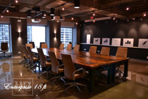 18′ Boardroom Table – 7′ wide – Made of four 9′ x 3.5′ tables – Leg Casters for easy table movement – Straight 4″x 4″ windbrace beams legs – Black skirting + legs – Reclaimed Pine – Premium epoxy/matte polyurethane finish