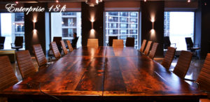 18′ Boardroom Table – 7′ wide – Made of four 9′ x 3.5′ tables – Leg Casters for easy table movement – Straight 4″x 4″ windbrace beams legs – Black skirting + legs – Reclaimed Pine – Premium epoxy/matte polyurethane finish