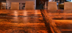18′ Boardroom Table – 7′ wide – Made of four 9′ x 3.5′ tables – Leg Casters for easy table movement – Straight 4″x 4″ windbrace beams legs – Black skirting + legs – Reclaimed Pine – Premium epoxy/matte polyurethane finish