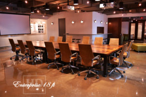 18′ Boardroom Table – 7′ wide – Made of four 9′ x 3.5′ tables – Leg Casters for easy table movement – Straight 4″x 4″ windbrace beams legs – Black skirting + legs – Reclaimed Pine – Premium epoxy/matte polyurethane finish