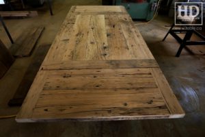 Description: Custom Unfinished Reclaimed Wood Furniture by HD Threshing Floor Furniture – Rustic, Authentic Ontario Barnwood Construction – Threshing Floor Board Tops – Grainery Board Construction Cabinetry – Original pioneer distressing kept – Original barnwood edges maintained