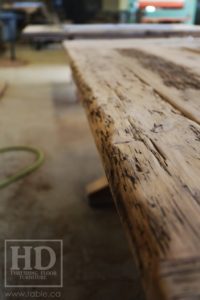 Description: Custom Unfinished Reclaimed Wood Furniture by HD Threshing Floor Furniture – Rustic, Authentic Ontario Barnwood Construction – Threshing Floor Board Tops – Grainery Board Construction Cabinetry – Original pioneer distressing kept – Original barnwood edges maintained