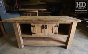 Description: Custom Unfinished Reclaimed Wood Furniture by HD Threshing Floor Furniture – Rustic, Authentic Ontario Barnwood Construction – Threshing Floor Board Tops – Grainery Board Construction Cabinetry – Original pioneer distressing kept – Original barnwood edges maintained