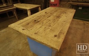 Description: Custom Unfinished Reclaimed Wood Furniture by HD Threshing Floor Furniture – Rustic, Authentic Ontario Barnwood Construction – Threshing Floor Board Tops – Grainery Board Construction Cabinetry – Original pioneer distressing kept – Original barnwood edges maintained