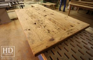 Description: Custom Unfinished Reclaimed Wood Furniture by HD Threshing Floor Furniture – Rustic, Authentic Ontario Barnwood Construction – Threshing Floor Board Tops – Grainery Board Construction Cabinetry – Original pioneer distressing kept – Original barnwood edges maintained