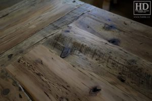 Description: Custom Unfinished Reclaimed Wood Furniture by HD Threshing Floor Furniture – Rustic, Authentic Ontario Barnwood Construction – Threshing Floor Board Tops – Grainery Board Construction Cabinetry – Original pioneer distressing kept – Original barnwood edges maintained