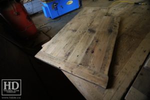 Description: Custom Unfinished Reclaimed Wood Furniture by HD Threshing Floor Furniture – Rustic, Authentic Ontario Barnwood Construction – Threshing Floor Board Tops – Grainery Board Construction Cabinetry – Original pioneer distressing kept – Original barnwood edges maintained