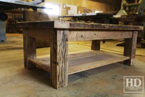 Description: Custom Unfinished Reclaimed Wood Furniture by HD Threshing Floor Furniture – Rustic, Authentic Ontario Barnwood Construction – Threshing Floor Board Tops – Grainery Board Construction Cabinetry – Original pioneer distressing kept – Original barnwood edges maintained