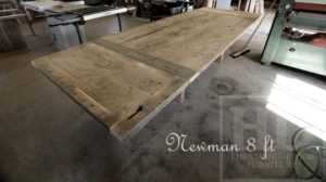 Details: 8 ft Reclaimed Wood Table – 3″ Post Plank Style Base – Reclaimed Pine Threshing Floor Construction – No epoxy – Matte Polyurethane Finish – Original Barnwood Edges & Distressing Maintained – Two Leaf Extensions
